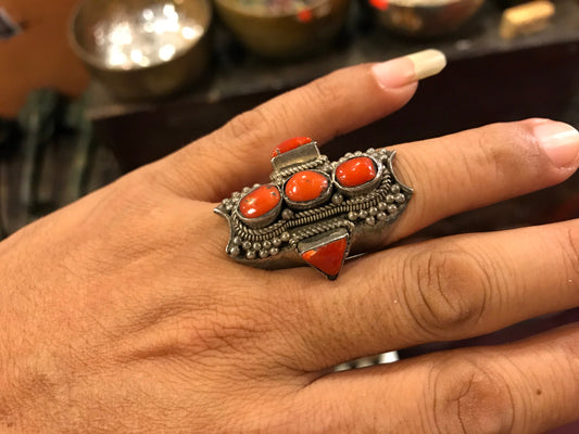 Antique Tibetan coral Ring, Size 8.5, Tribal, Bohemian style, Authentic Tibetan coral ring. Traditional Saddle Ring, Gypsy ring, protection.